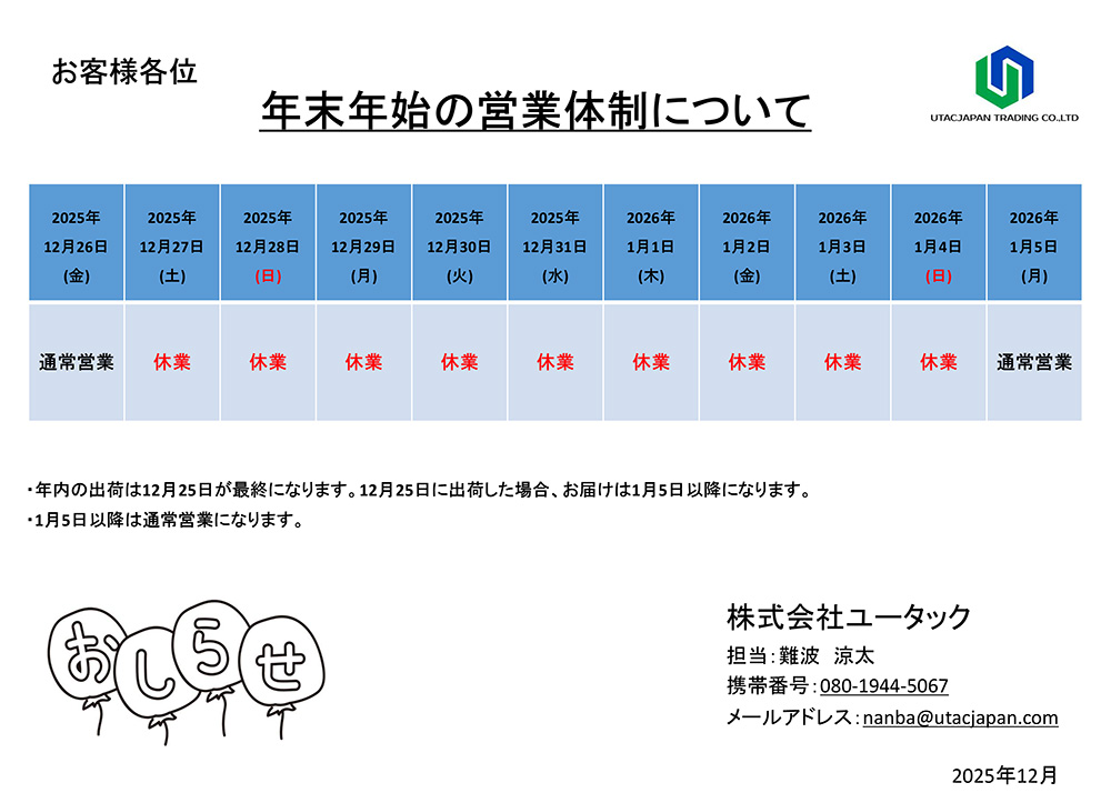 年末年始営業体制について